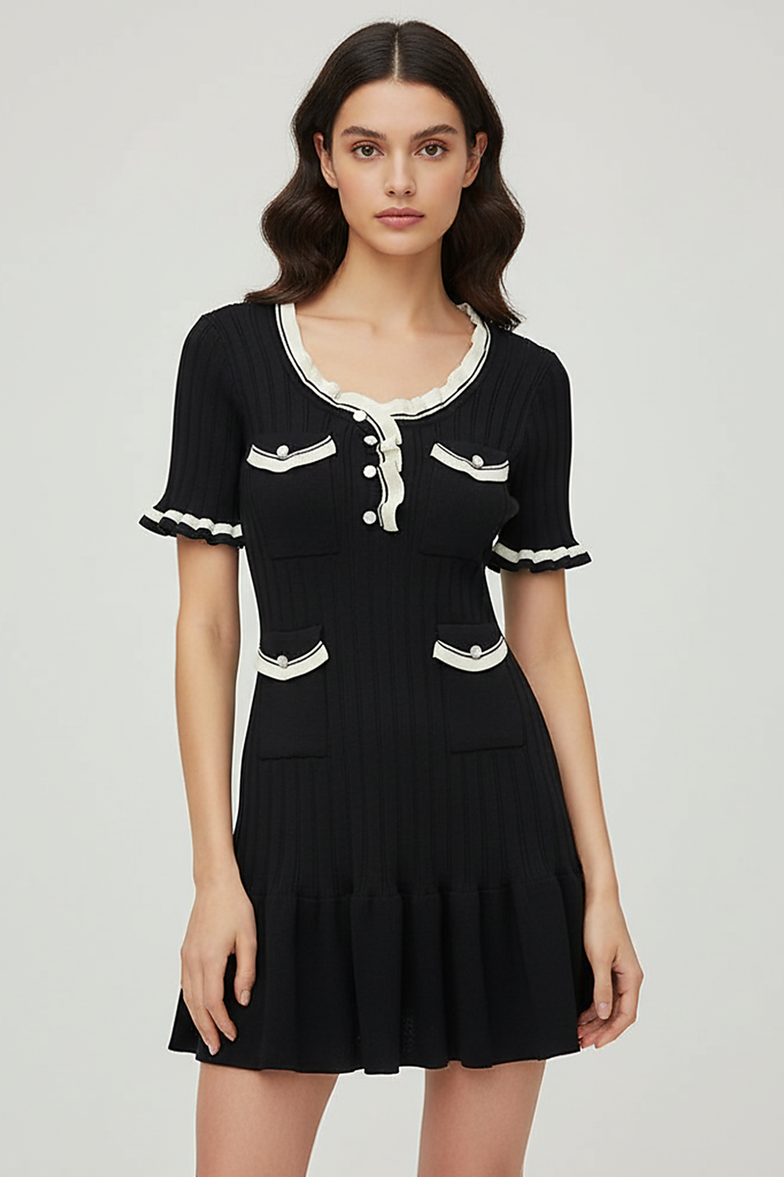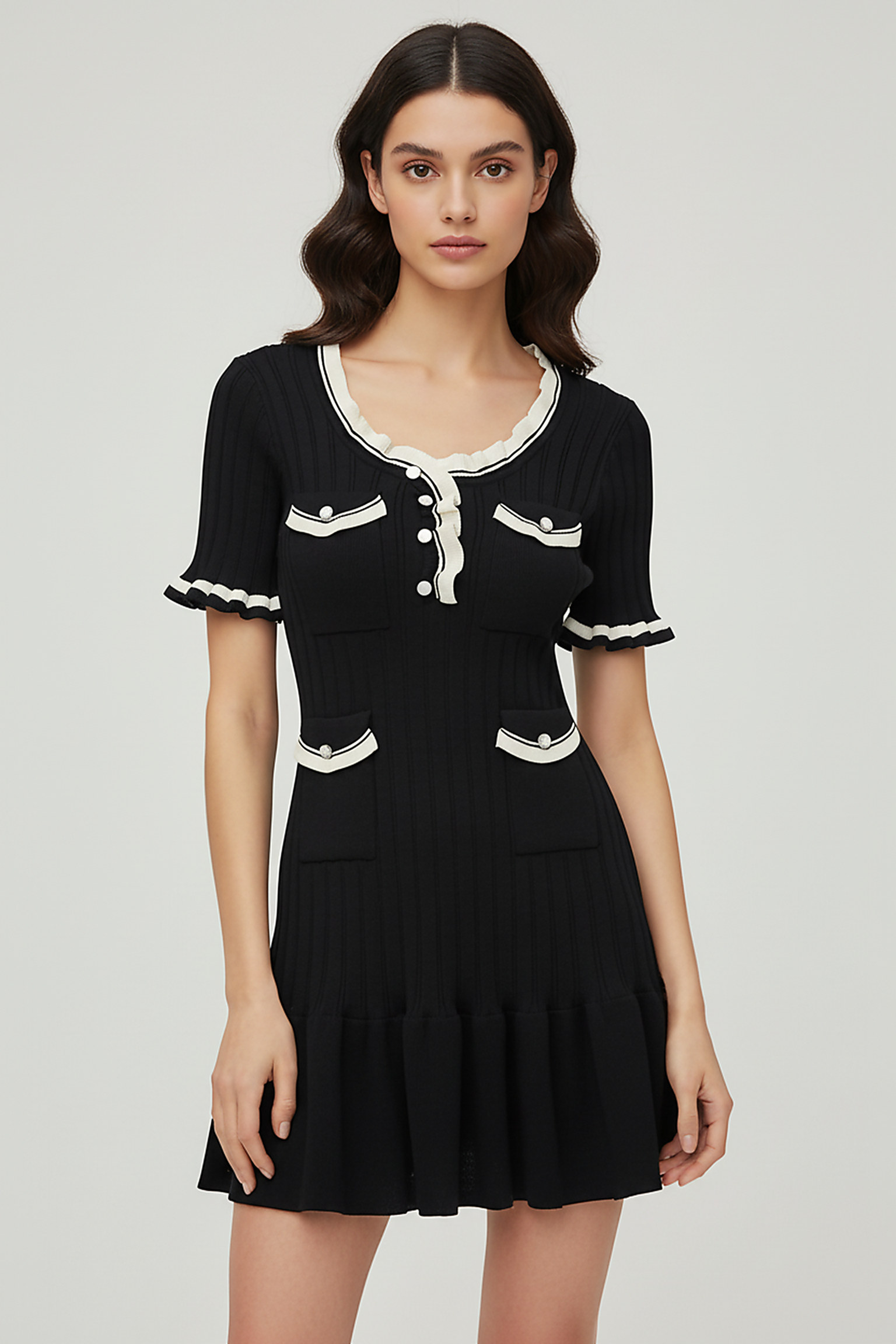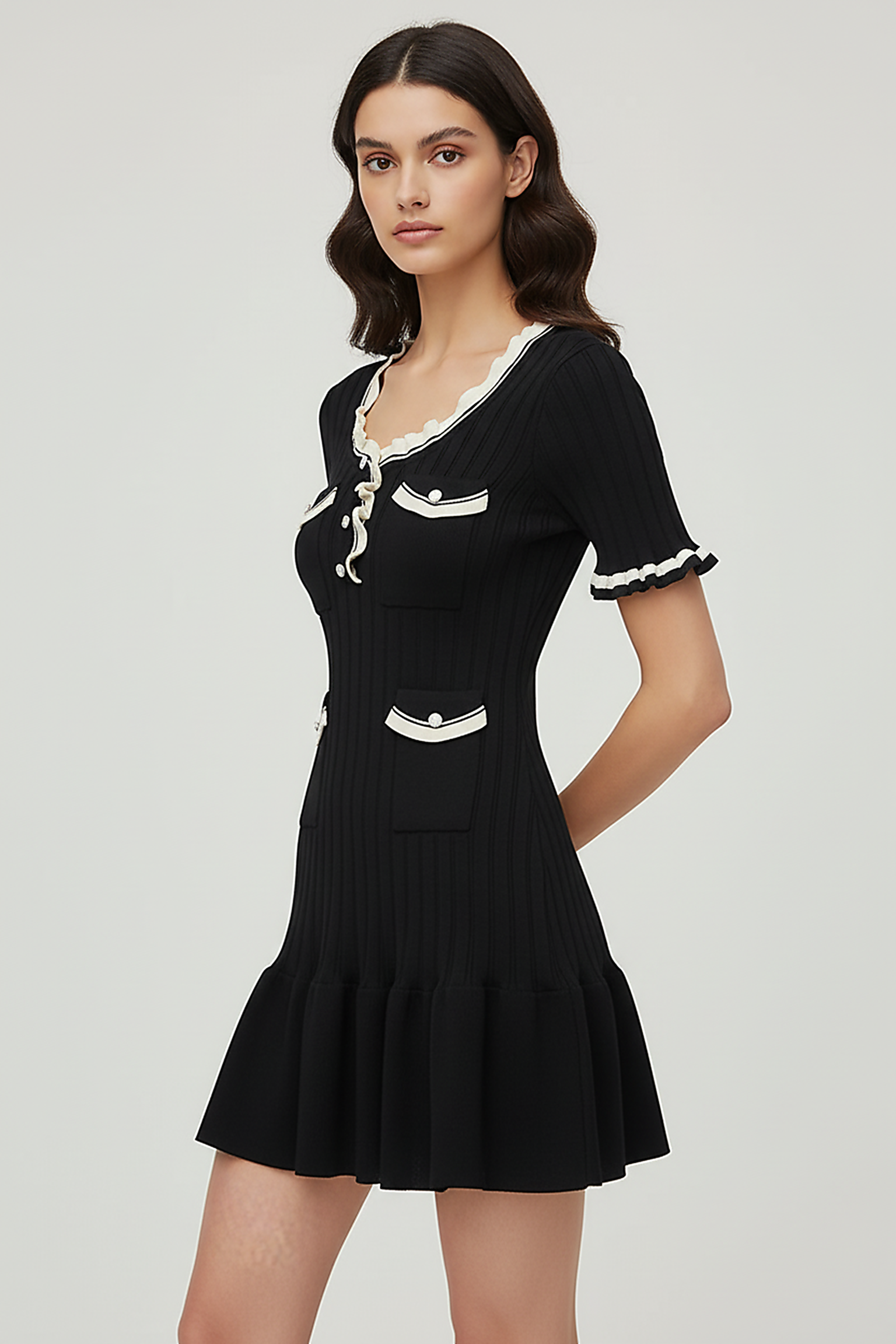 Every element of our Chic Ruffled Knitted Mini Dress has been thoughtfully designed to create a harmonious blend of elegance and playful charm, making it a truly distinctive garment. The dress features a beautifully crafted scoop neckline, framed by a delicate ruffled trim that adds a touch of whimsical sophistication. This trim is accentuated with a fine contrasting piping—crisp white against the black dress, and a subtle darker shade against the gray—creating a refined visual contrast that draws attention to the décolletage in an understated yet alluring manner. The neckline’s gentle curve is universally flattering, offering a balanced and graceful opening that enhances the natural lines of the upper body.