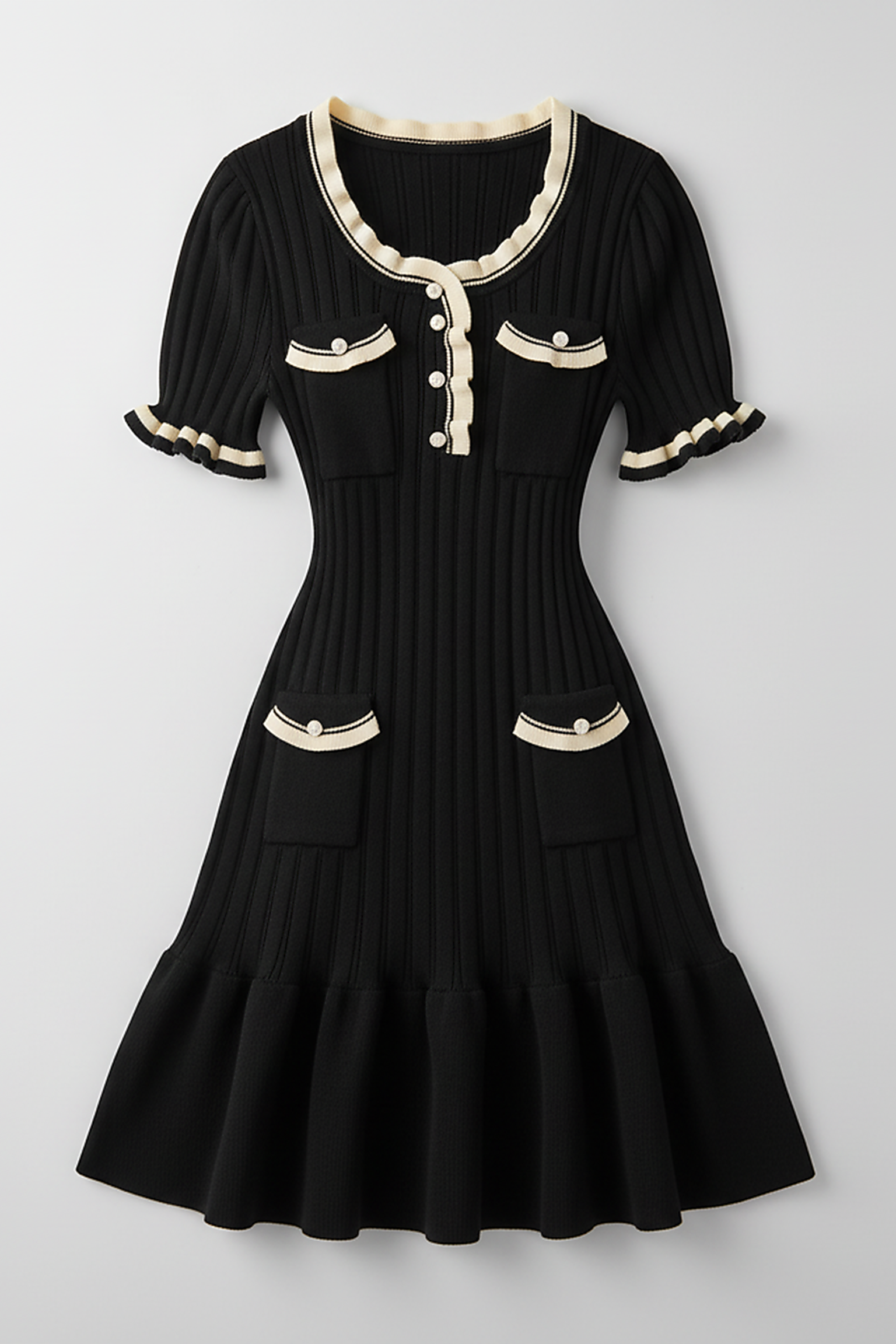 The front bodice of this pullover-style dress is meticulously detailed with a series of decorative elements that elevate its boutique appeal and provide a charming focal point. Down the center front, three elegant, pearl-like buttons are artfully arranged along a subtle placket, adding a classic touch without compromising the dress's sleek profile, as it is designed for effortless slip-on wear. These buttons, with their subtle sheen, catch the light beautifully. Flanking these buttons are two pairs of charming decorative flap pockets. The upper pair is strategically positioned on the chest, while the lower pair sits gracefully on the hips, creating a balanced and visually interesting design. Each faux pocket is outlined with the same contrasting trim seen on the neckline and cuffs, and finished with its own petite pearl-like button, creating a delightful sense of symmetry and intricate detail that is both stylish and functional in appearance, adding depth and character to the garment.