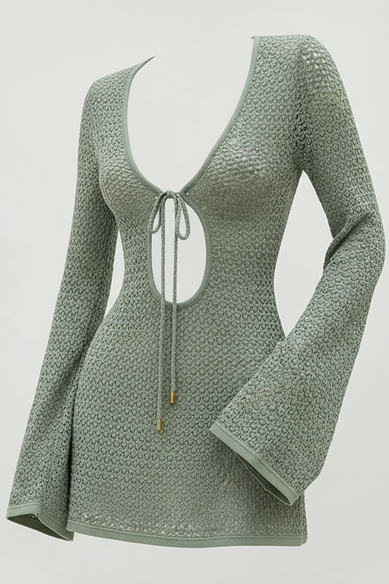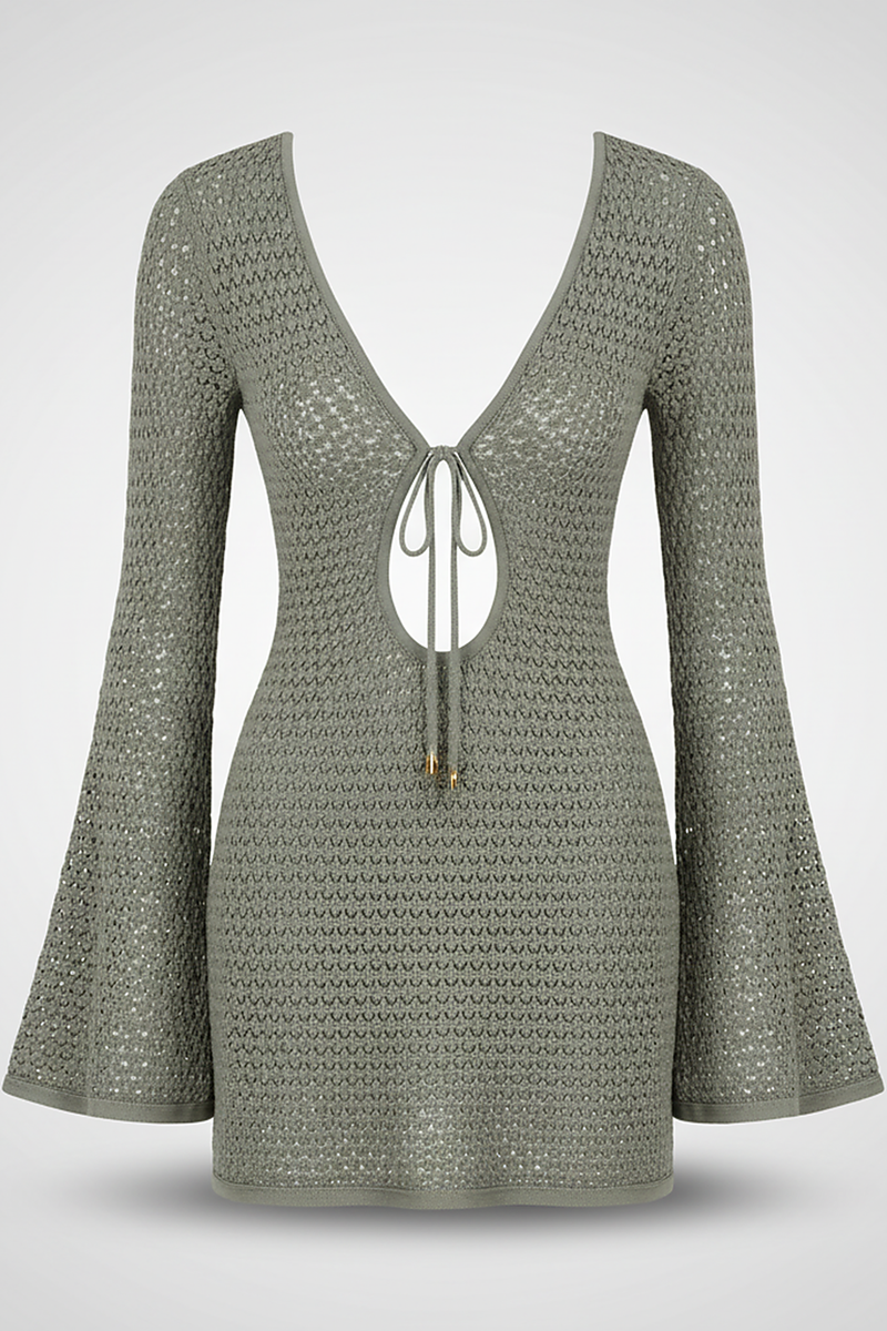 Hollow Out Beach Knit Short Dress with Lace-Up Flare Sleeves
