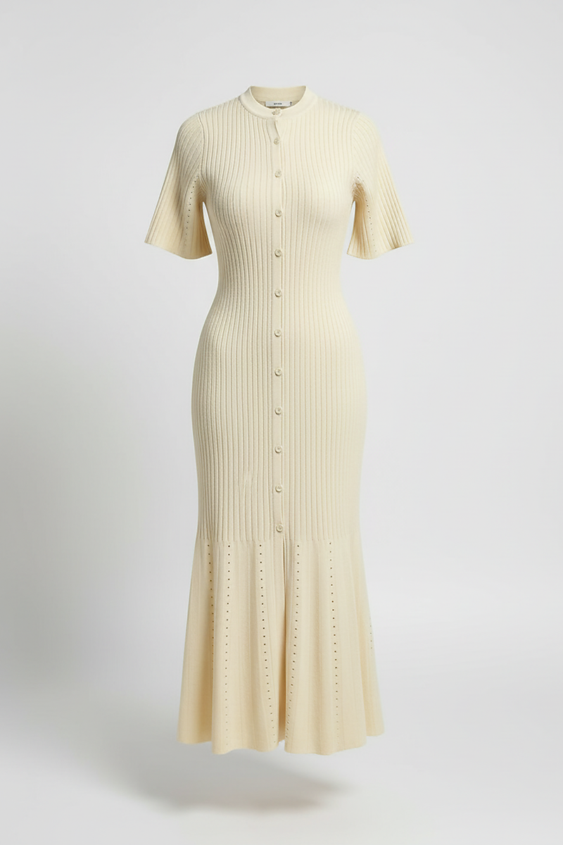 Every element of this dress is thoughtfully designed and meticulously executed to create a harmonious blend of timeless style, sophisticated comfort, and enduring quality. The Neckline features a classic O-neck (round neck) that offers a universally flattering and inherently elegant appeal, providing the perfect canvas to showcase your favorite delicate necklaces or simply appreciate its clean, refined line. The Sleeves are gracefully designed short sleeves, gently fitted to the arm, providing ideal coverage and ease of movement, making this dress perfectly suited for warmer seasons while maintaining a polished aesthetic. The Waist & Shape is beautifully defined by a slim silhouette that artfully skims the body, enhancing your natural contours with a flattering embrace without ever feeling restrictive. This body-skimming fit is further complemented by the exquisite vertical rib knit texture, which adds subtle visual interest, elongates the figure, and provides a delightful tactile dimension. The central Closure is a chic single-breasted button-front, featuring a series of elegant, tone-matched buttons that run gracefully down the entire front length of the dress. This detail not only provides a refined aesthetic and a touch of vintage-inspired charm but also offers a functional element, allowing for subtle adjustments in styling. There is no back slit, ensuring a sleek, uninterrupted line at the rear, contributing to the dress's sophisticated simplicity. A truly distinctive feature is the unique openwork knit pattern adorning the hemline, adding a touch of artisanal charm, visual lightness, and a delicate finish that sets this piece apart. Regarding Lining & Opacity, the dress is unlined, yet the high-quality, substantial knit fabric is expertly crafted to provide excellent opacity, ensuring confident and comfortable wear without any compromise on discretion.