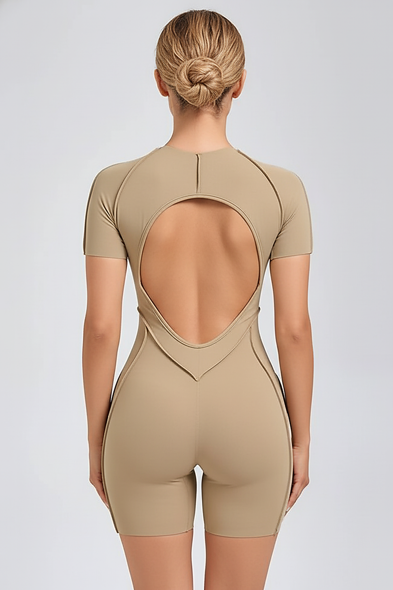 Emphasizing both comfort and confidence, the jumpsuit is unlined, allowing the premium fabric to perform directly against your skin, providing its full range of moisture-wicking and supportive benefits. Despite being unlined, the fabric is crafted to be completely opaque and rigorously squat-proof, guaranteeing full coverage and peace of mind through every bend, stretch, and pose. There are no slits in this design, maintaining its sleek, streamlined silhouette. A striking open back detail adds an element of sophisticated style and enhances breathability, ensuring you stay cool while making a subtle statement. The overall shape is a chic one-piece short jumpsuit, often referred to as a unitard, which offers a cohesive, curve-skimming fit from shoulder to thigh, perfectly balancing athletic functionality with contemporary fashion. The distinctive contouring seams, visible throughout the garment, are not merely decorative; they are strategically placed to sculpt and define the figure, enhancing the jumpsuit's already flattering silhouette and adding an architectural quality to its design.