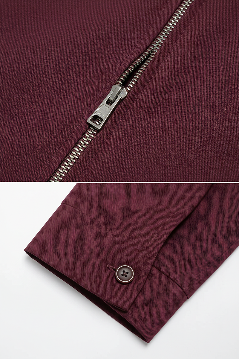 Slit: The design of this bomber jacket features a clean, uninterrupted silhouette, purposefully omitting any slits. This deliberate choice contributes to its streamlined and classic aesthetic, maintaining a continuous line from the shoulders to the ribbed hem. The absence of slits ensures a polished and cohesive look, emphasizing the jacket's refined simplicity and making it a versatile piece that pairs seamlessly with a wide array of bottoms, from tailored trousers to casual denim, without any visual breaks.