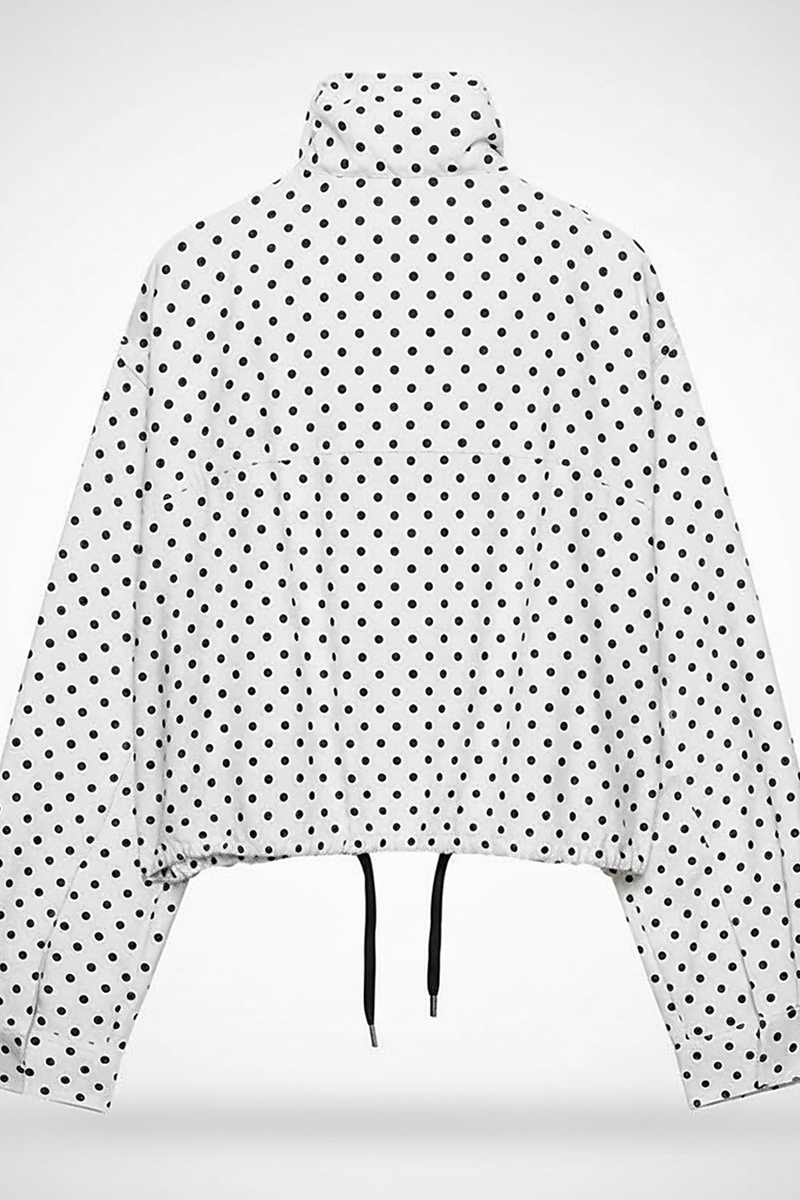 Category: casual outerwear, elegant jacket, fall jacket, high street style, ladies outerwear, long sleeve, office wear, polka dot print, print jacket, short coat, spring jacket, womens jacket