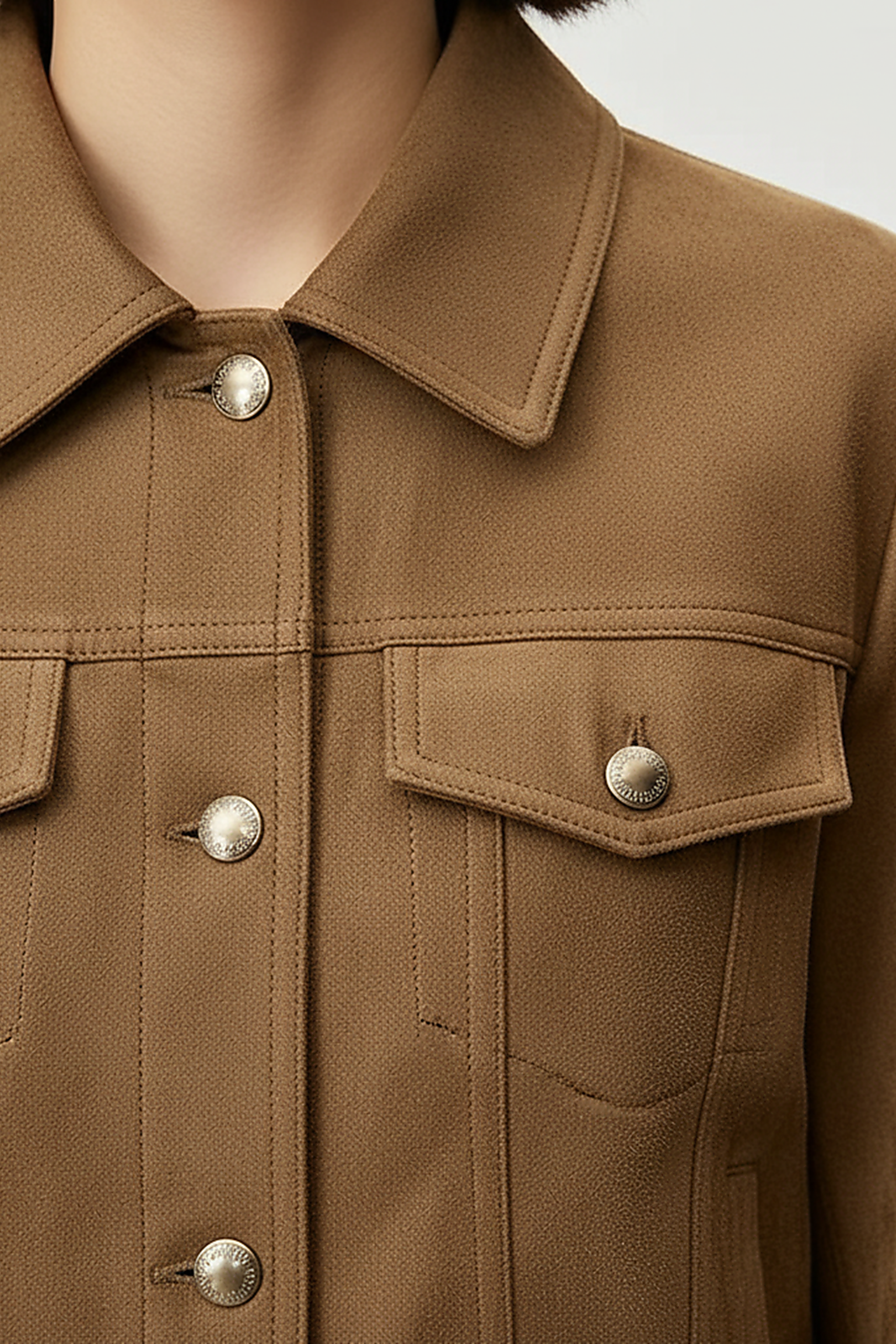 Neckline: The jacket features a timeless pointed shirt collar, a classic detail that lends an air of sophisticated structure to the garment. This crisp collar can be worn buttoned for a more formal, contained look, or unbuttoned and casually open to reveal layers beneath, offering versatile styling possibilities. Its defined shape beautifully frames the face.