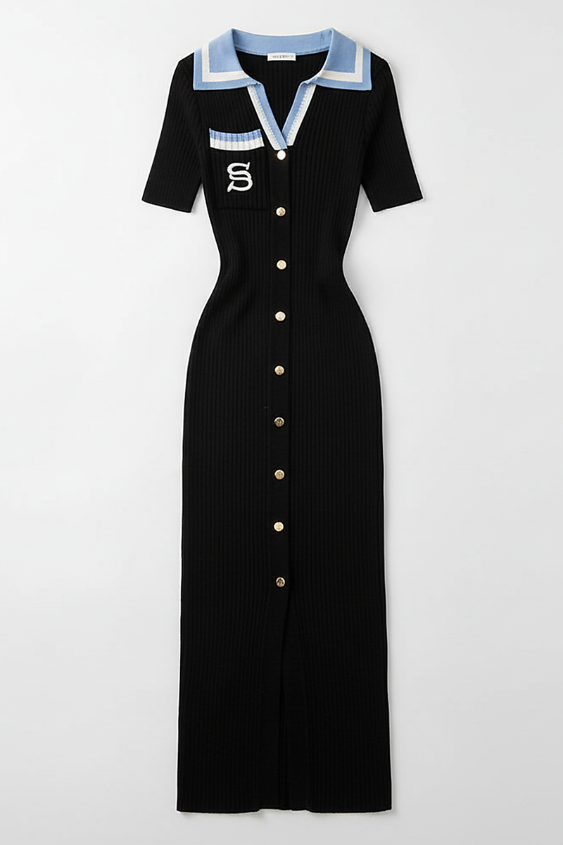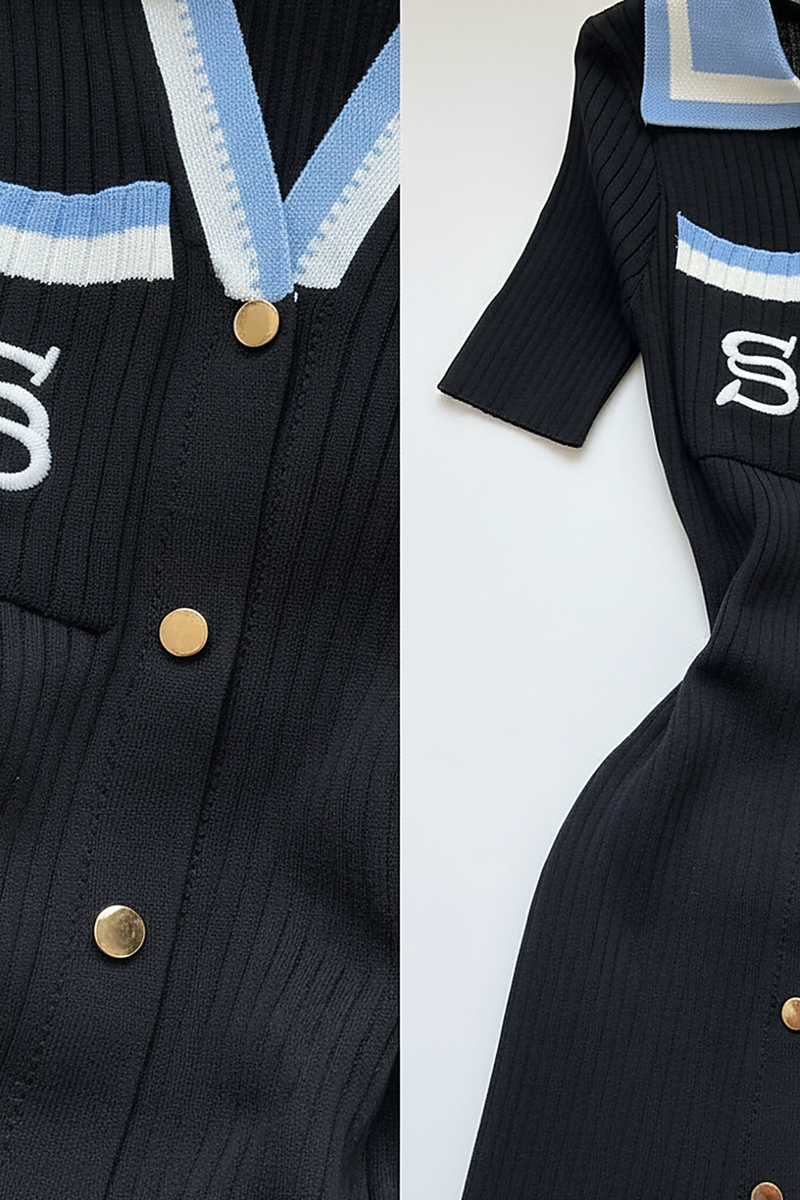 Every element of this knit dress has been thoughtfully considered to create a piece that is both stylish and inherently comfortable. The neckline features a sophisticated polo collar, which frames the décolletage beautifully with its refined structure. This transitions into a chic V-neck placket, adorned with three elegant gold-toned buttons that offer a touch of classic charm and allow for adjustable styling. The dress is designed with graceful short sleeves, providing comfortable coverage and a polished finish that complements the overall silhouette.